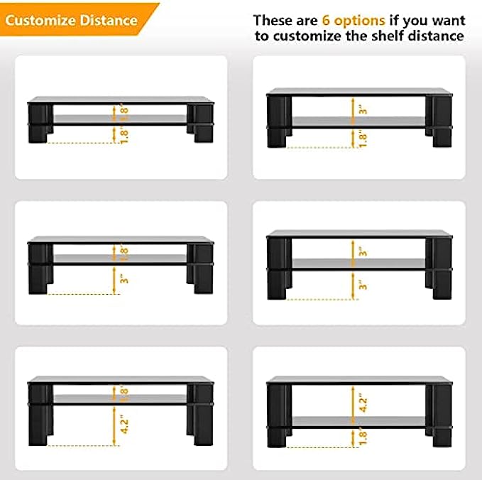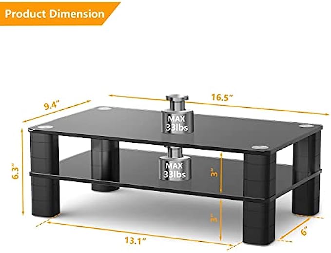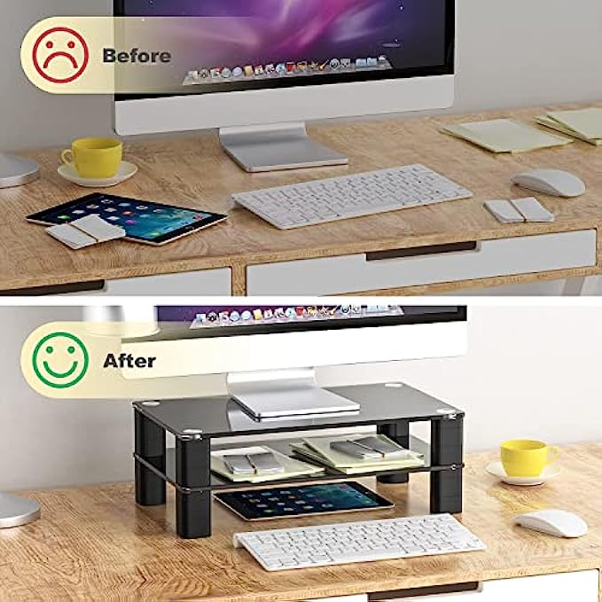• ☝MONITOR STAND SIZE - Product dimension 16.5"L * 9.4"W *6.3"H, this glass monitor stand is suitable for most of devices. The legs on the riser are very easy to adjust to the ideal height, total 6 different heights for optional. The space between legs is 13.1"L * 6"W, perfectly for storing your office supplies.