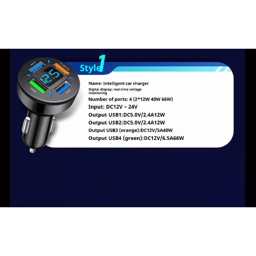 66W Car Charger 4USB Port Digital Display Super Fast Charging