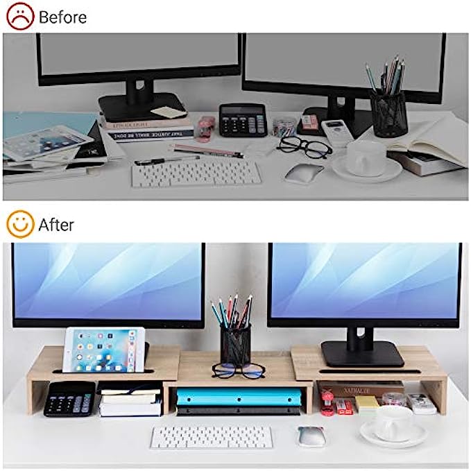 • GET A TIDY WORKING SPACE: Lift your monitors by the desktop shelf and store your keyboard, office files, notebook, calculator underneath it. Get rid of messy desk, keeps your working space tidy.