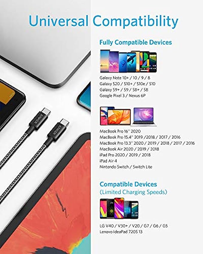 Anker New Nylon USB C to USB C Cable 100W 10ft, USB 2.0 Type C Charging Cable Fast Charge for MacBook Pro 2020, iPad Pro 2020, iPad Air 4, Galaxy S20, Google Pixel, Switch, and More(Black)