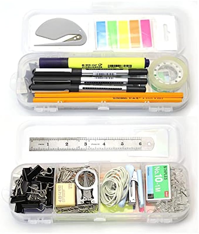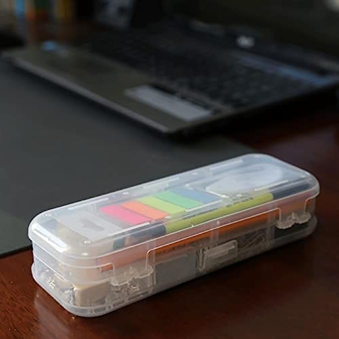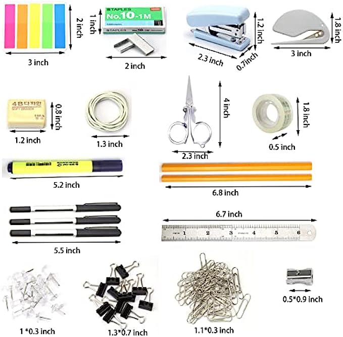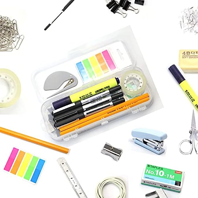 • ALL IN ONE OFFICE KIT: you will find all the common office supplies from this little box, includs Binder Clips*12, Sharpener*1, Paper Clip*80, Stapler*1, Staples*1000, Rubber Band*12, Eraser*1, Clear Push Pin*18, Letter Opener*1, Page Marker*5, Steel Ruler*1, Pencil*2, Highlighter*1, Black Pens*3, Steel Scissor*1, Clear Tape*1,Clear Pencil Box* 1