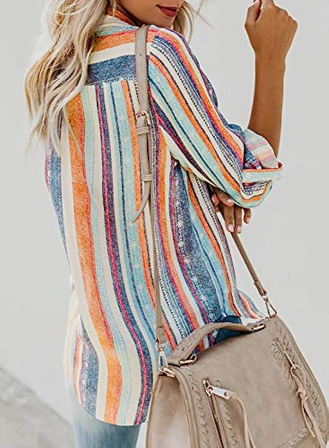 • Features: Button down, V neck, Stripes, Color Block,Cuffed Sleeve