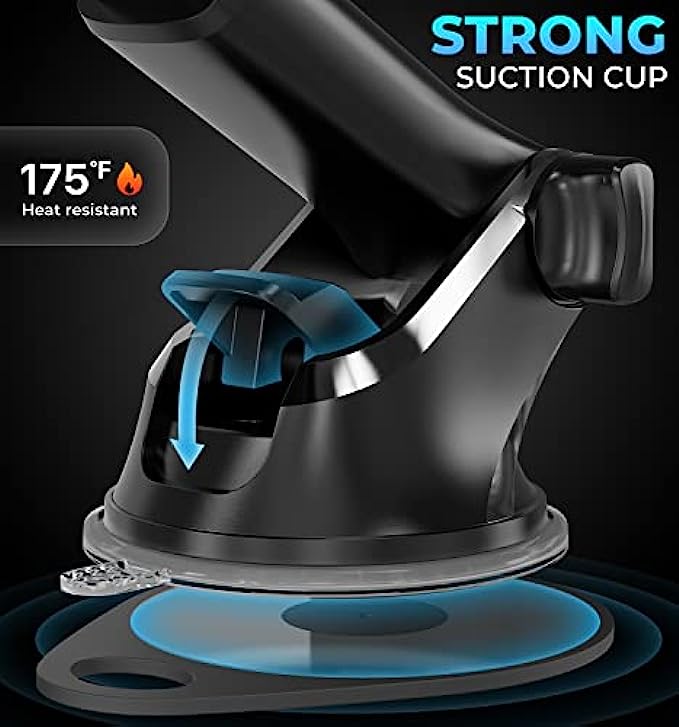 • Enhanced Suction Cup - Ensuring that your car mount for phone will stay firmly in its position, even on bumpy roads, sharp turns, or emergency brakes. Holds firmly in up to 175 F.