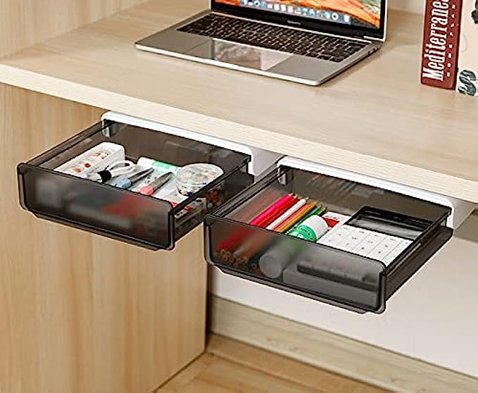 • ✅ ORGANIZE THE DESKTOP : This hidden drawer storage will hold quite a lot of office supplies such as pencil, airpods, charger, notebook, sticky note, tissues and etc. Organize your desktop especially suitable for standing desk without drawer