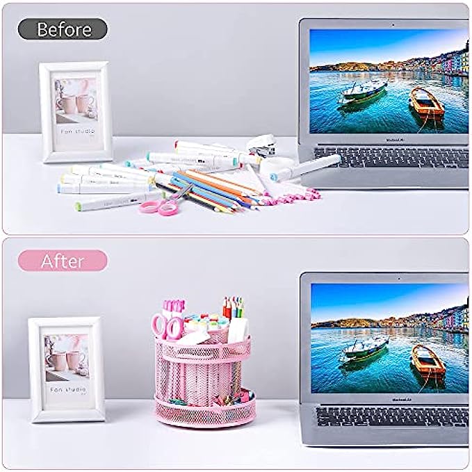 【360 DEGREE REVOLVING DESIGN】 This desktop organizer can be turned up to 360 degree rotation to the left and right .You can easily reach out to something useful and practical you need during working or studying.The product can be bilaterally and smoothly rotated, just turn as you please.