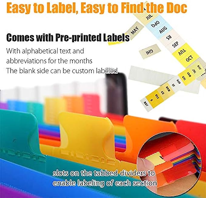 • Colorful Expanding File Folder: the multi-color plastic label reveals both the document and the label tab, making all your files simple to retrieve. Include Pre-printed labels with alphabetical ABC and the months, and also can be custom labeled