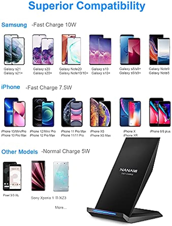 Fast Wireless Charger,NANAMI Qi Certified Wireless Charging Stand Compatible iPhone 13/12/SE 2020/11/XS Max/XR/X/8 Plus,Samsung Galaxy S22 S21 S20 S10 S9 S8 Note 20 Ultra/10/9/8 and Qi-Enabled Phone