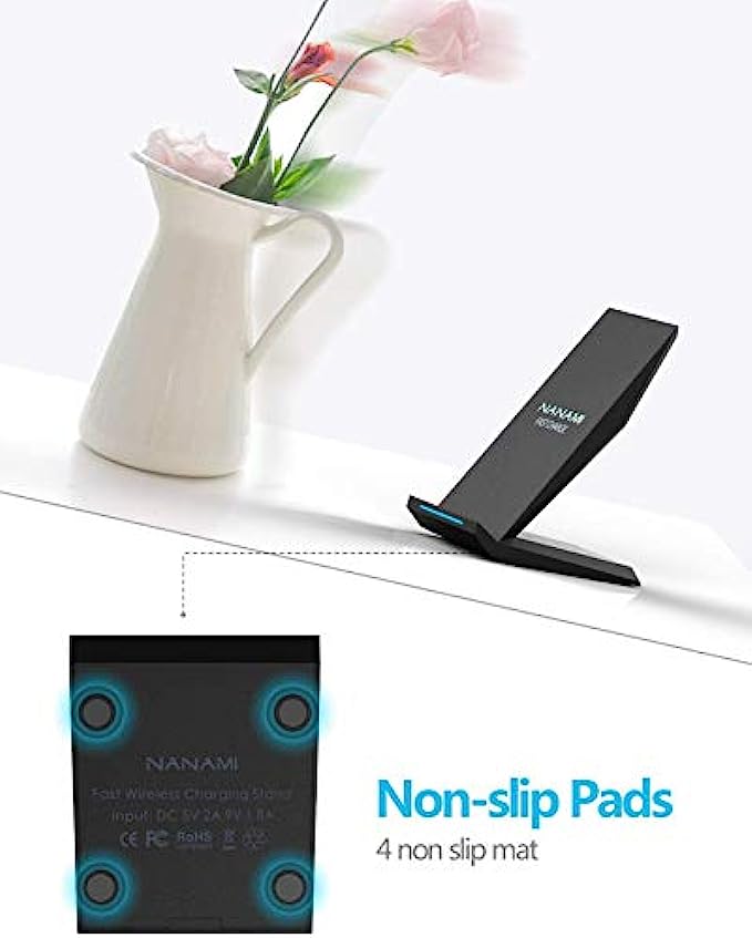 • INTELLIGENT LED INDICATOR- Multi-colored LED lights indicate charging status. Solid blue for standby mode, green for charging mode). Blue LED indicator will flash in 1s/time if your phone is not properly aligned or any metal attachment detected! One-year Warranty if you got any problems about the wireless charger you got from NANAMI. (Just simply drop us an email with your order number and we will give you the best solution as your wishes. )