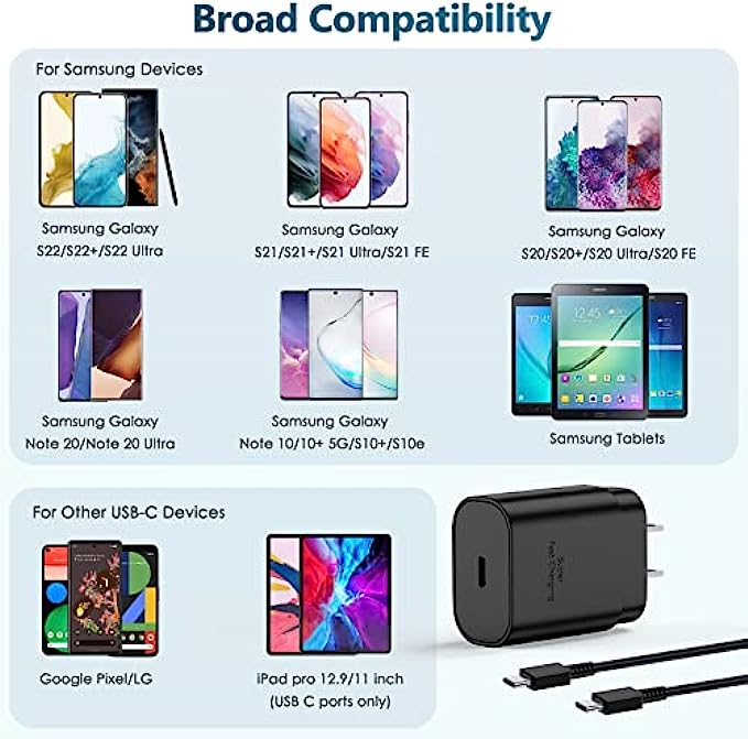 • 【Super Fast Charger】The 25W Type C charger cable kit supports multiple fast charging techonology, Samsung super fast charging, PD 3.0, PPS, and QC 4.0. It provide fast charging up to 25W output, super fast charging for Samsung Galaxy S21, S21 Ultra, S21 Plus, S22, S22+, S22 Ultra, Note 10, Note 20, S20 from 0% to 50% in just 30 min,full charge Galaxy S21 in 1h, full charge Galaxy S22 in 50 min.